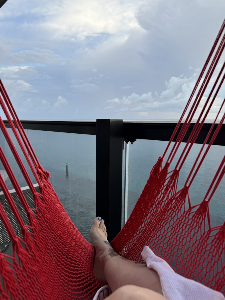 From there, we met our Rockstar Agent, basically our personal concierge for the week before heading straight to our suite (yes, it was already ready when we boarded!). We had booked the Seriously Suite, and seriously… it delivered complete with a fully stocked bar, a record player for old-school vinyl vibes, a bathroom with a cheeky peek-a-boo shower, and out on the balcony, Virgin’s signature red hammock swaying in the sea breeze. The Rockstar life was definitely my cup of tea! Rockstar life? Achieved!